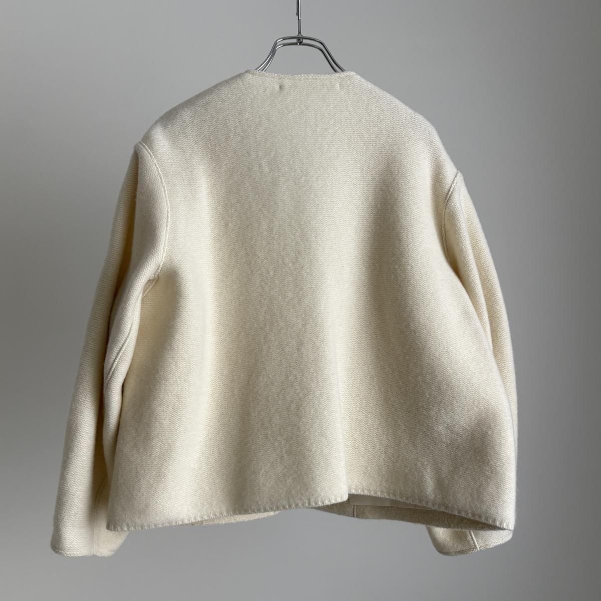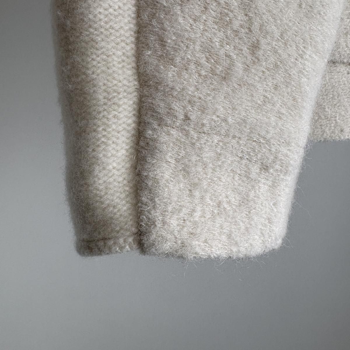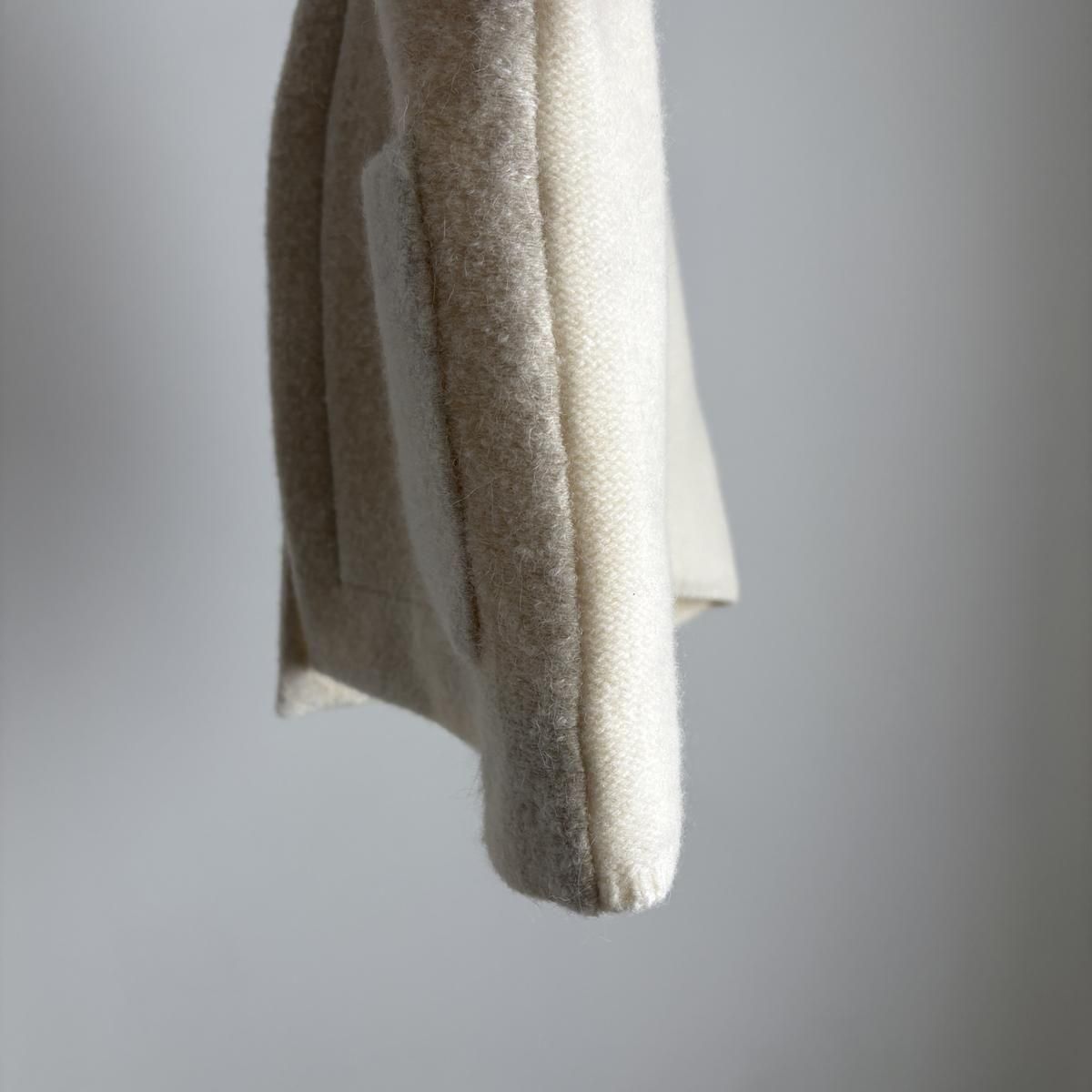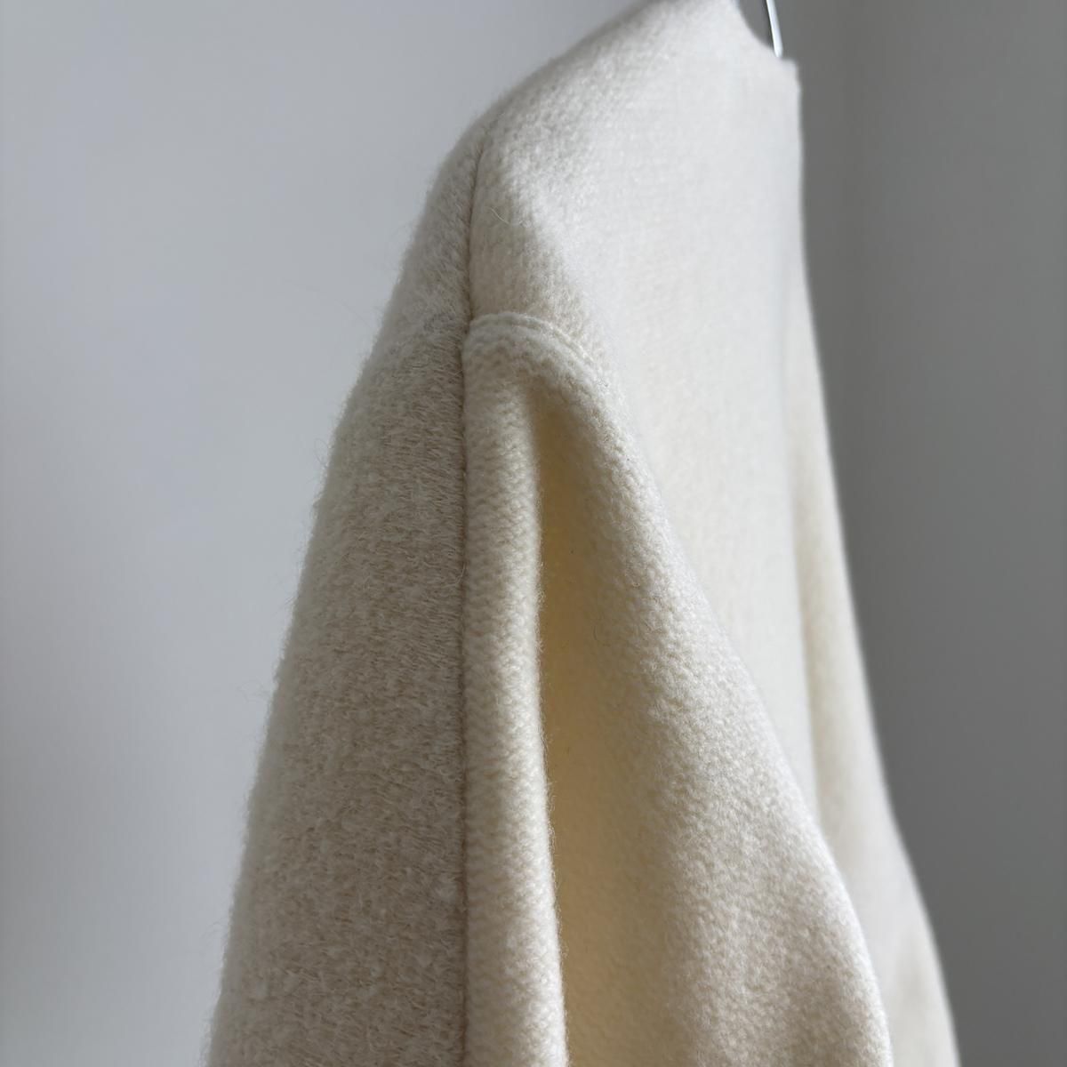 昨年大変人気だった前面はアンゴラツイード、後ろ面はニットとの組み合わせの、ノーカラーVネックジャケット。自店では入荷と同時に早々に完売してしまったアイテムでした。嬉しいことに今シーズンも展開されていました!前後で仕立ての生地が異なる、とても凝ったデザイン、ディテールです。お袖も同様に前と後ろ面では素材が異なります。