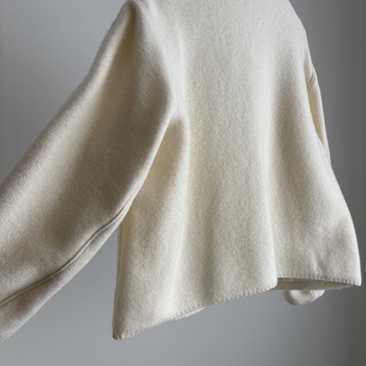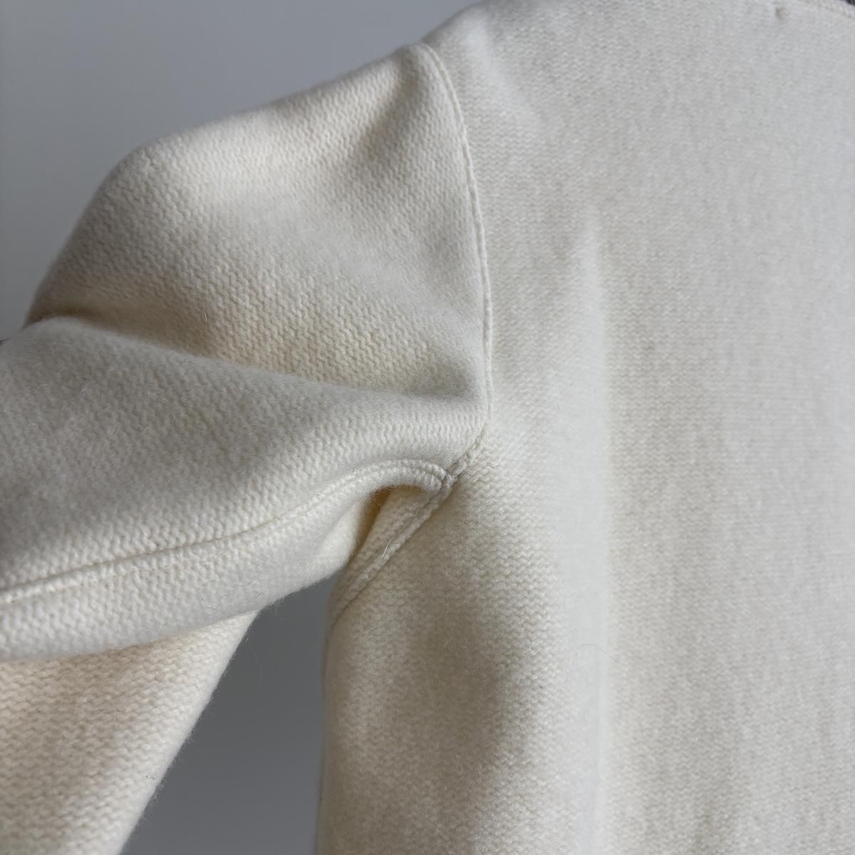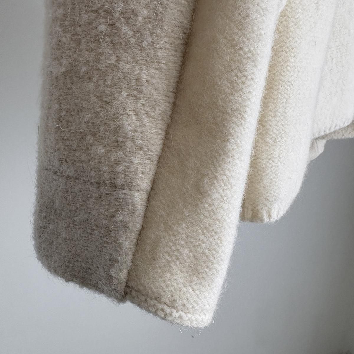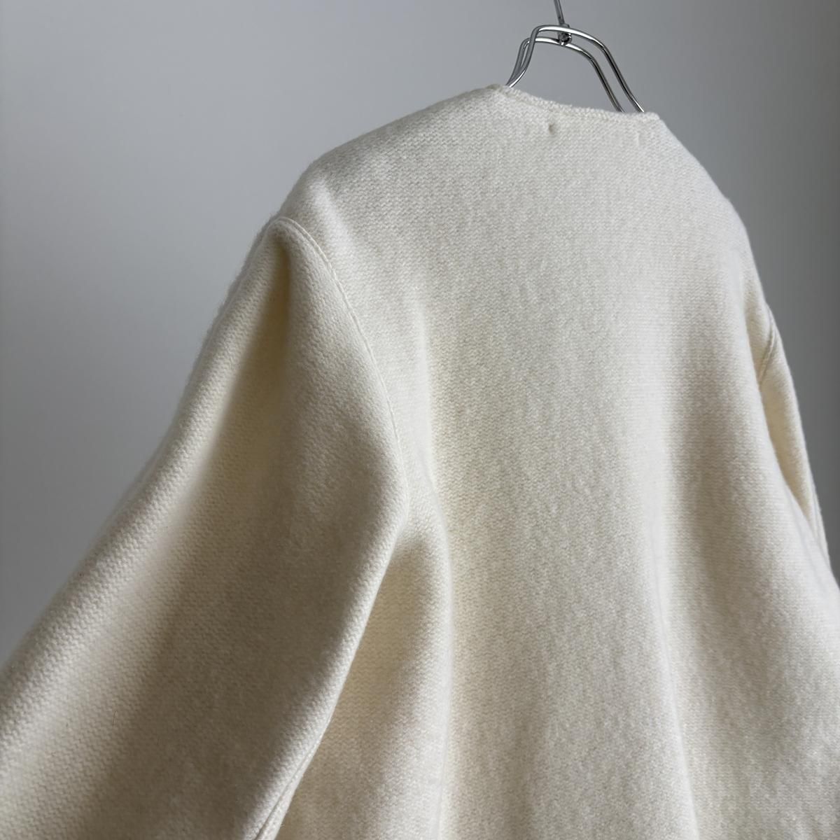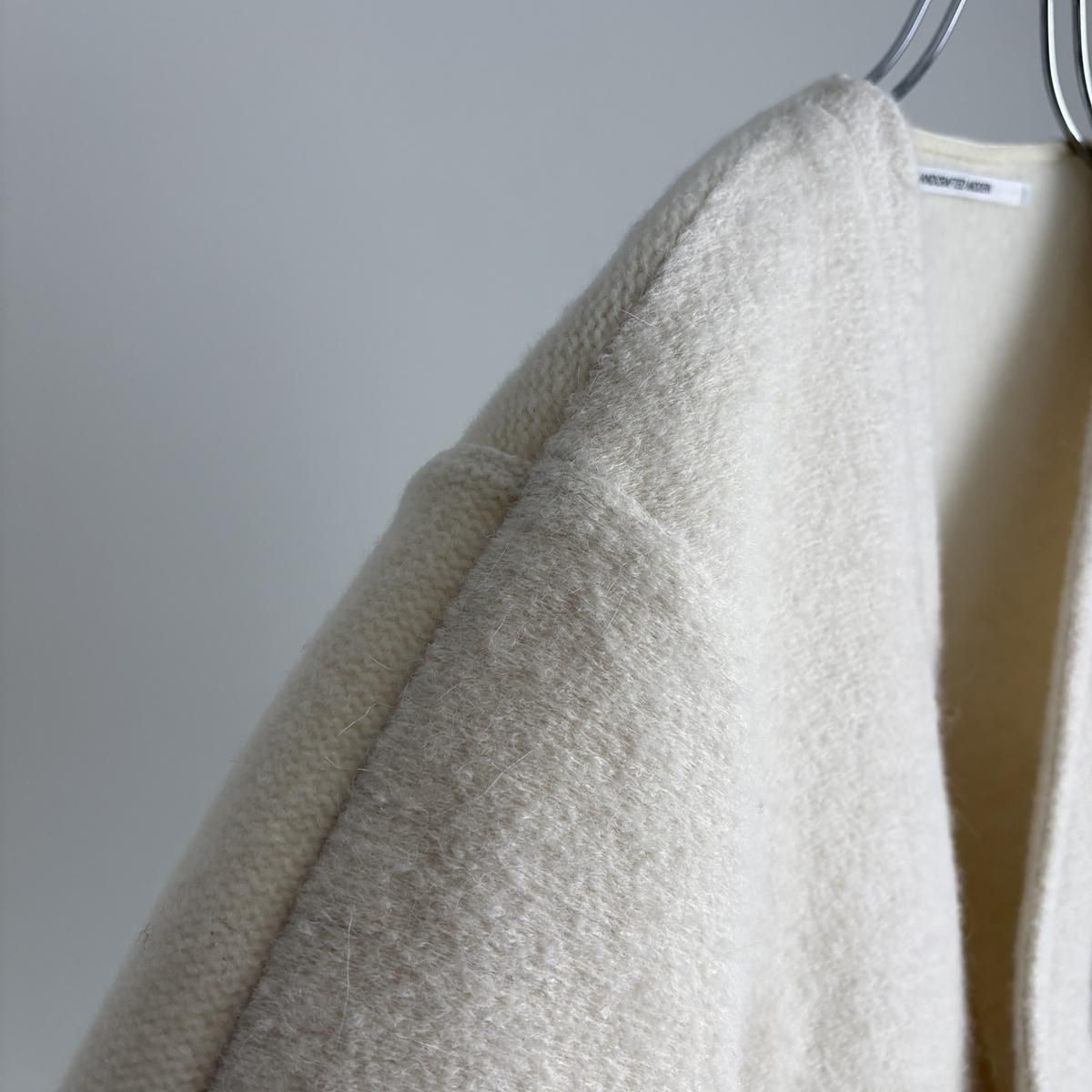 昨年大変人気だった前面はアンゴラツイード、後ろ面はニットとの組み合わせの、ノーカラーVネックジャケット。自店では入荷と同時に早々に完売してしまったアイテムでした。嬉しいことに今シーズンも展開されていました!前後で仕立ての生地が異なる、とても凝ったデザイン、ディテールです。お袖も同様に前と後ろ面では素材が異なります。