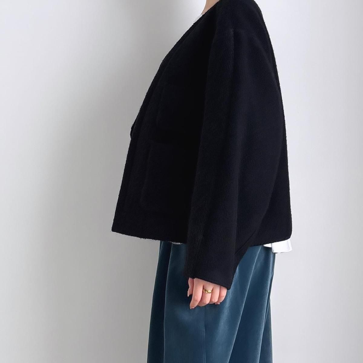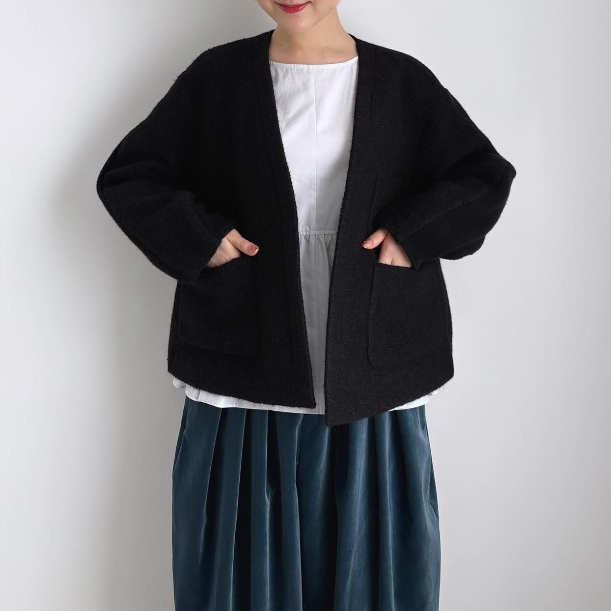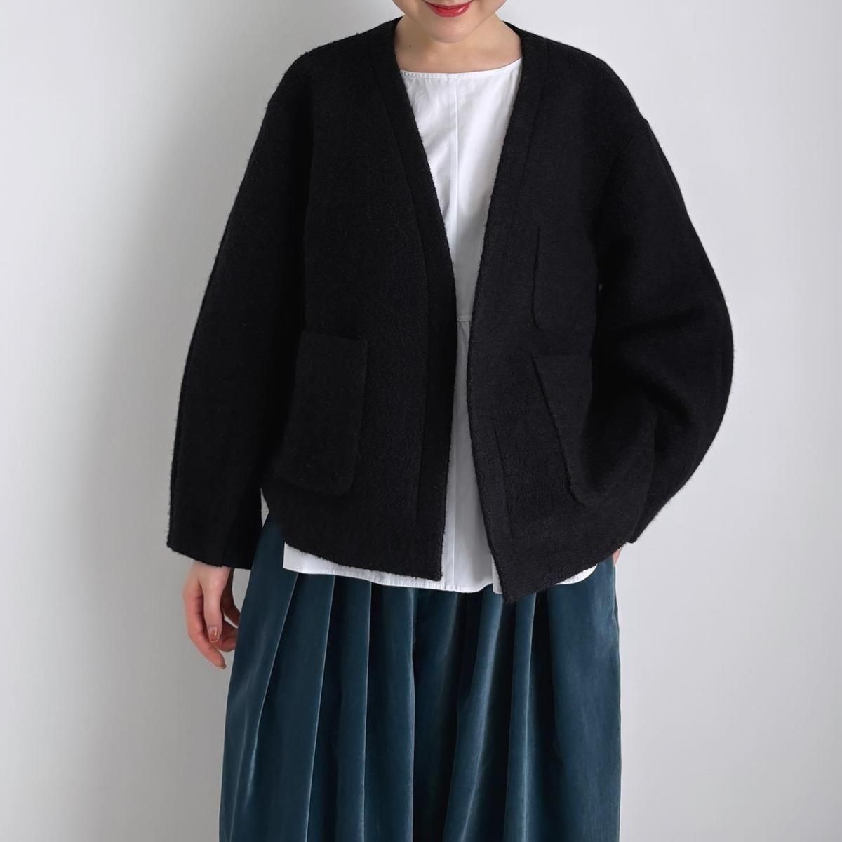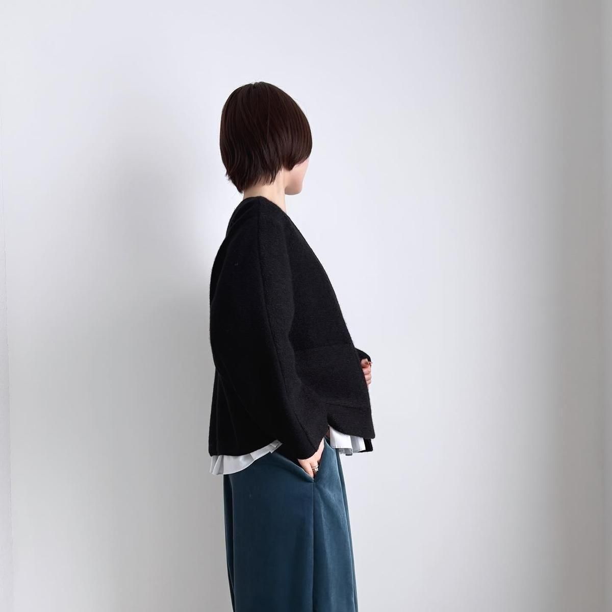 TENNEさんオリジナルでつくられた贅沢なアンゴラツィードの生地は品の良さもうかがえつつ、雰囲気ががあります。ボタンレスのジャケットです。身頃ついた外付けの横長ポケットがぷっくりとして、またアシンメトリーなつき方もチャーミング。