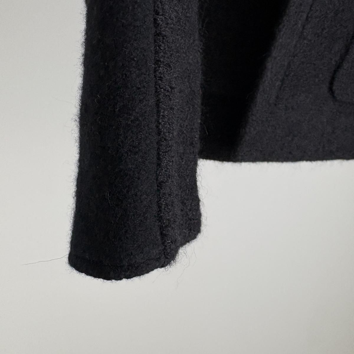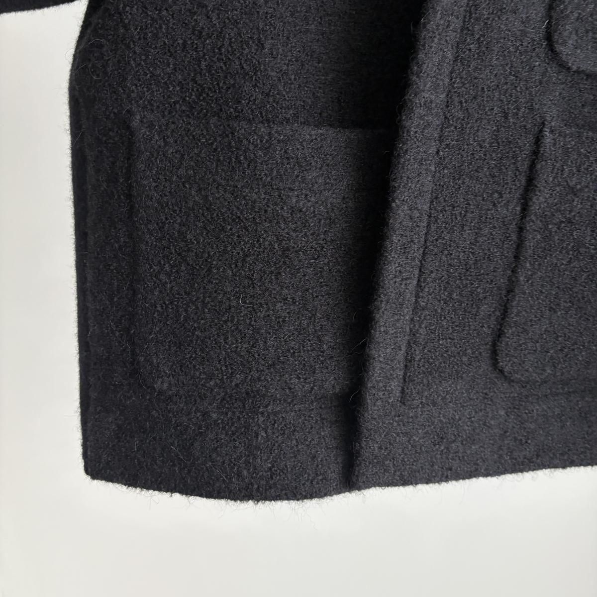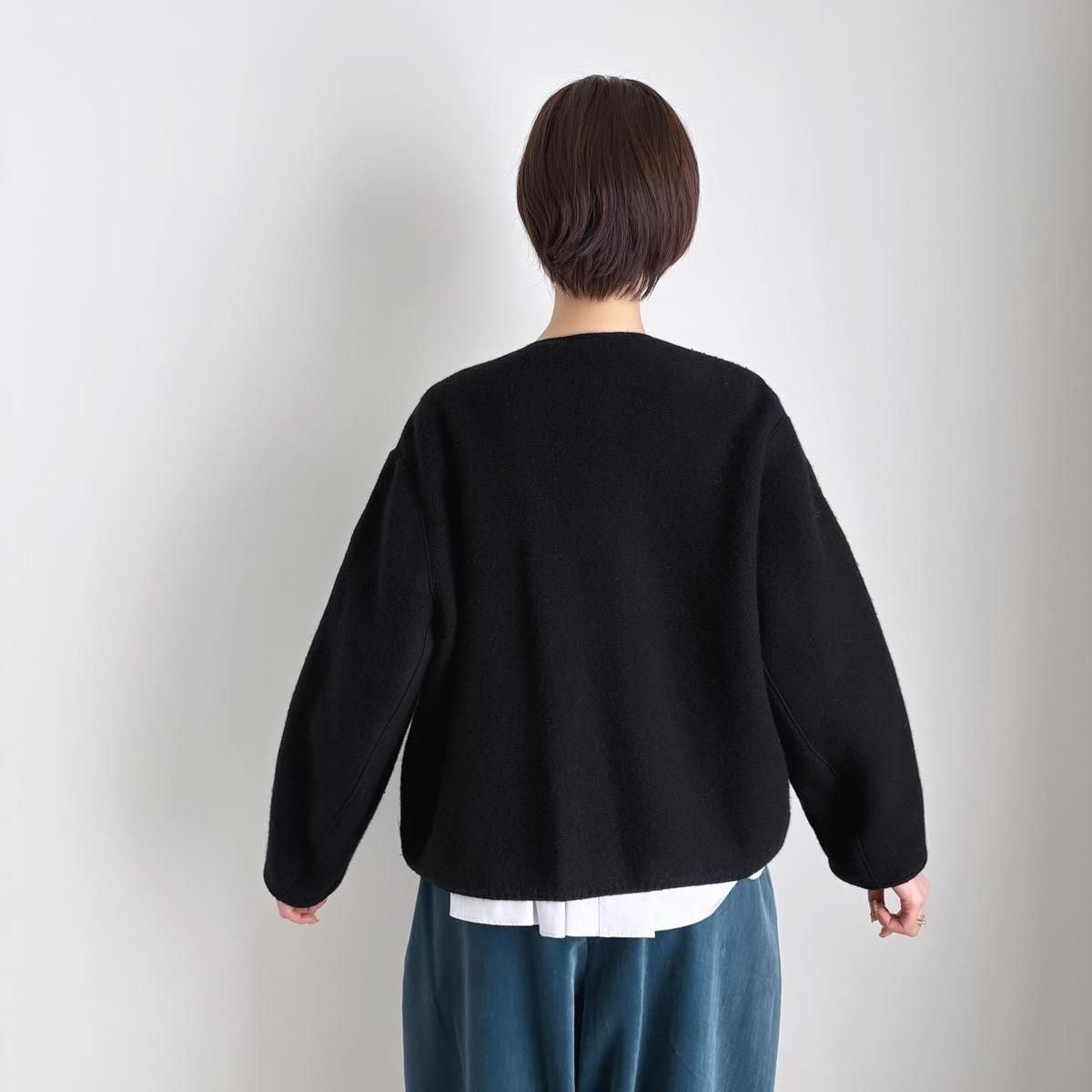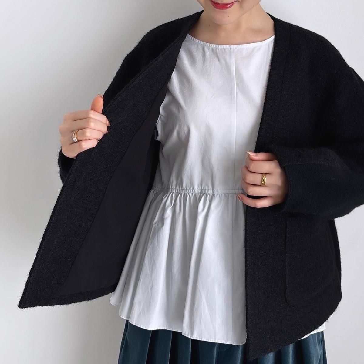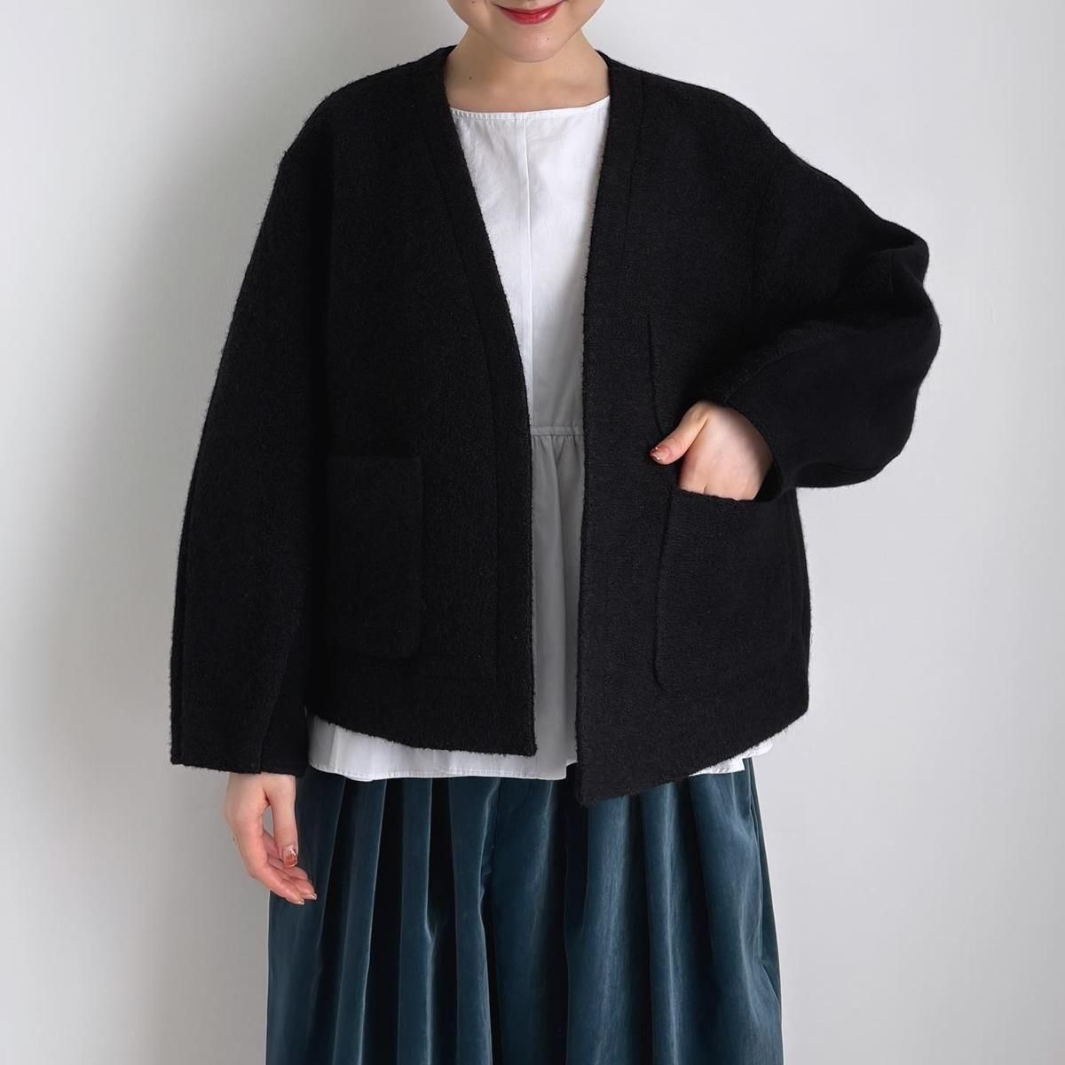TENNEさんオリジナルでつくられた贅沢なアンゴラツィードの生地は品の良さもうかがえつつ、雰囲気ががあります。ボタンレスのジャケットです。身頃ついた外付けの横長ポケットがぷっくりとして、またアシンメトリーなつき方もチャーミング。
