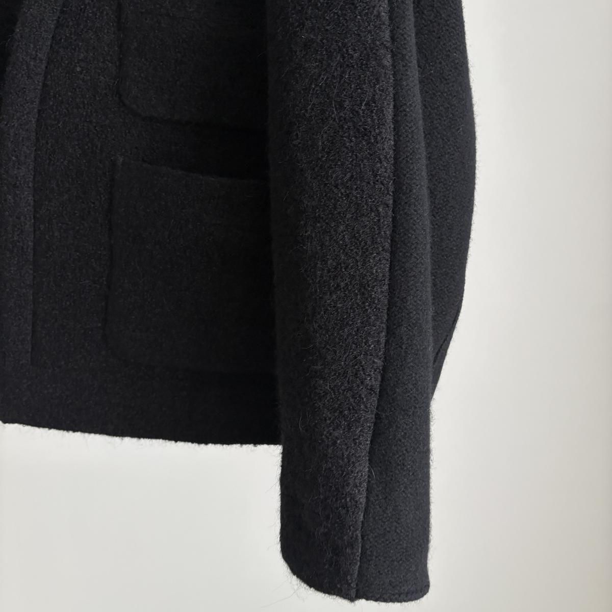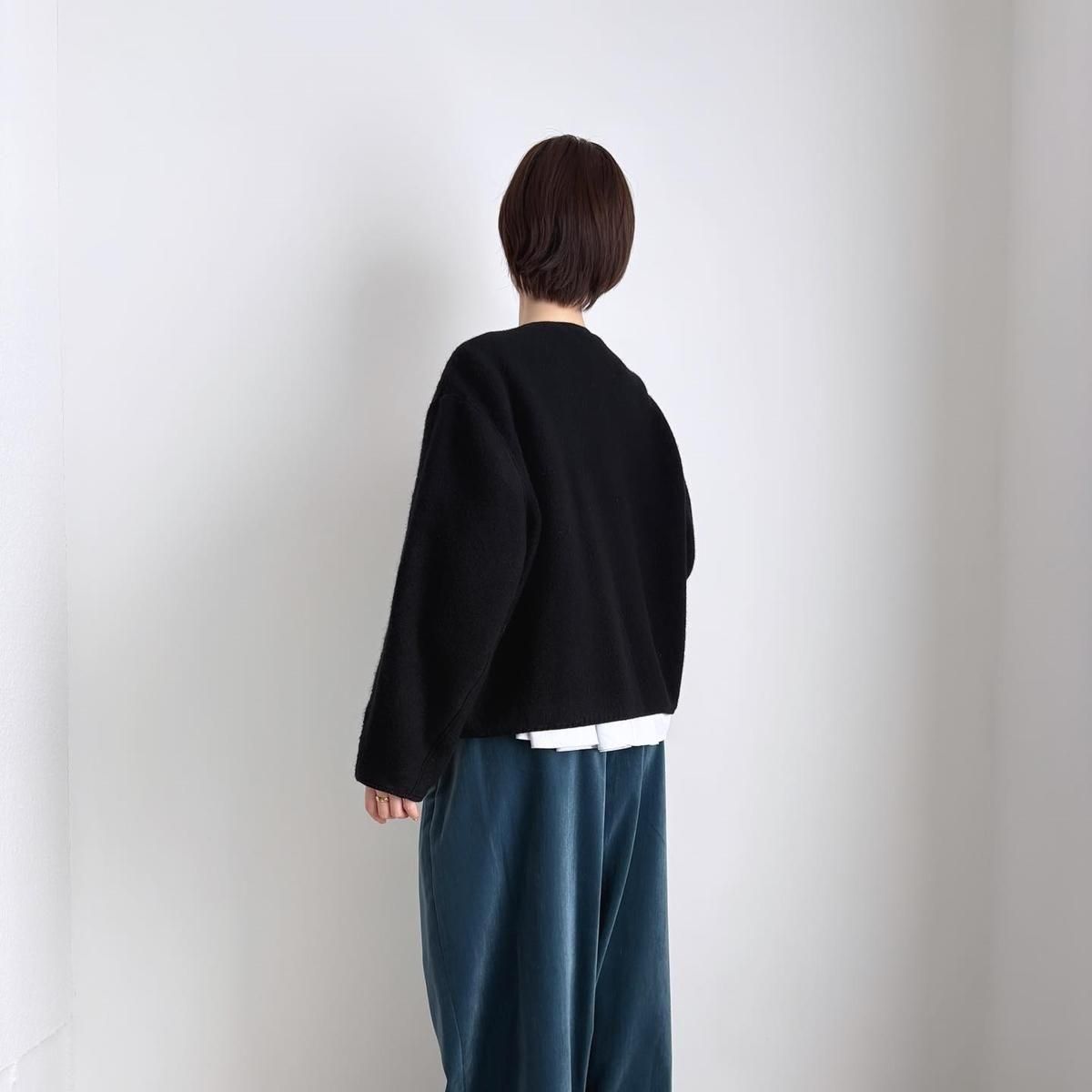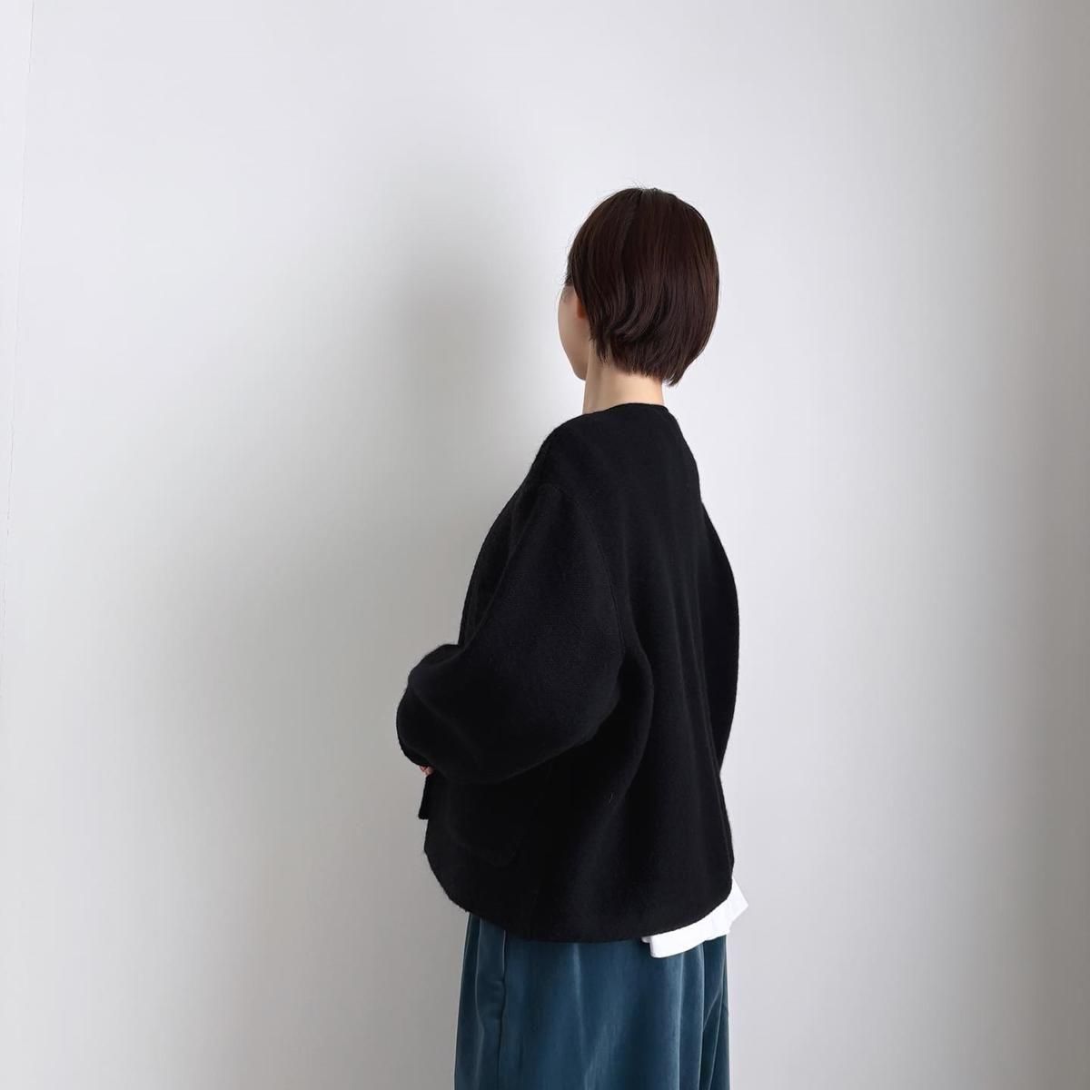 昨年大変人気だった前面はアンゴラツイード、後ろ面はニットとの組み合わせの、ノーカラーVネックジャケット。自店では入荷と同時に早々に完売してしまったアイテムでした。嬉しいことに今シーズンも展開されていました!前後で仕立ての生地が異なる、とても凝ったデザイン、ディテールです。お袖も同様に前と後ろ面では素材が異なります。