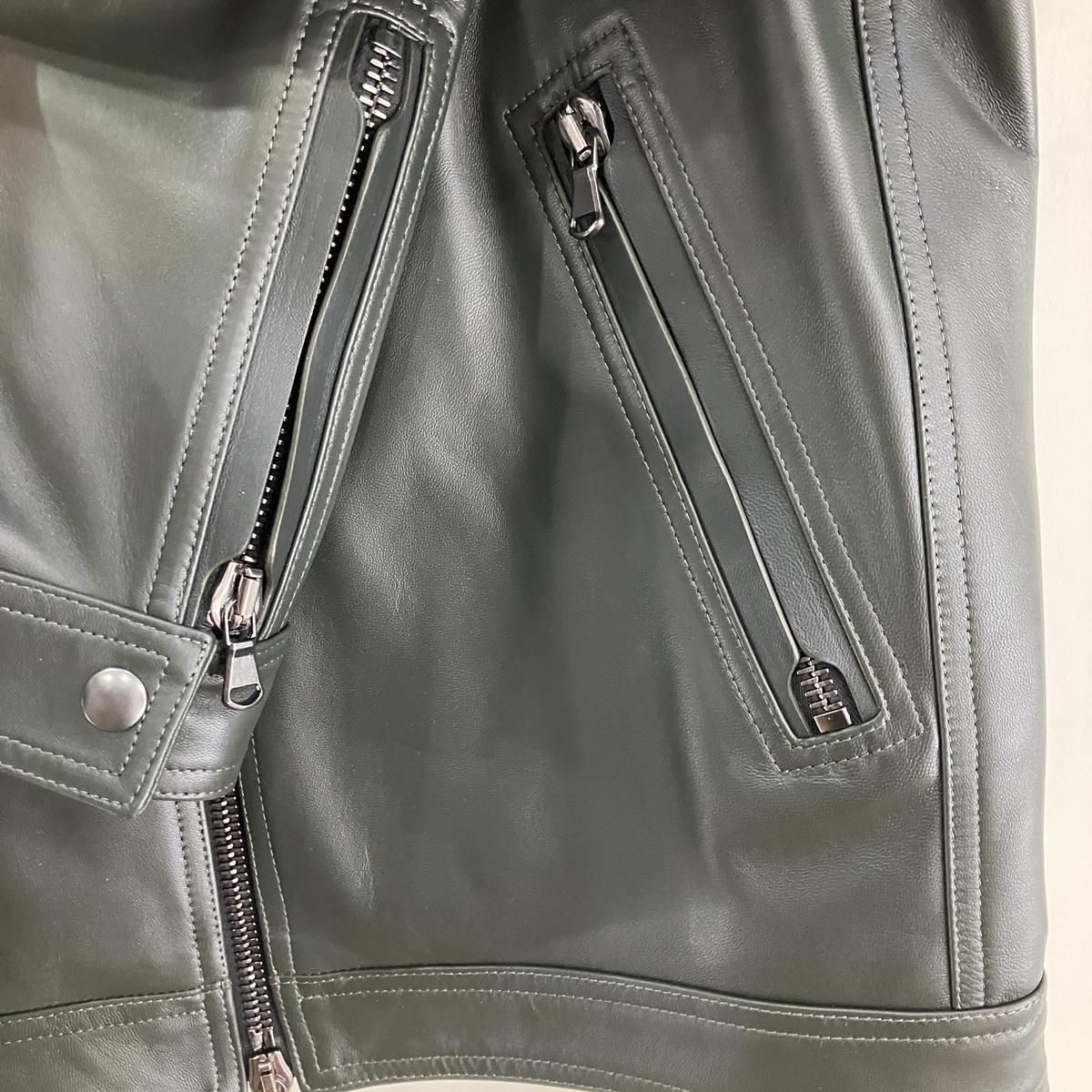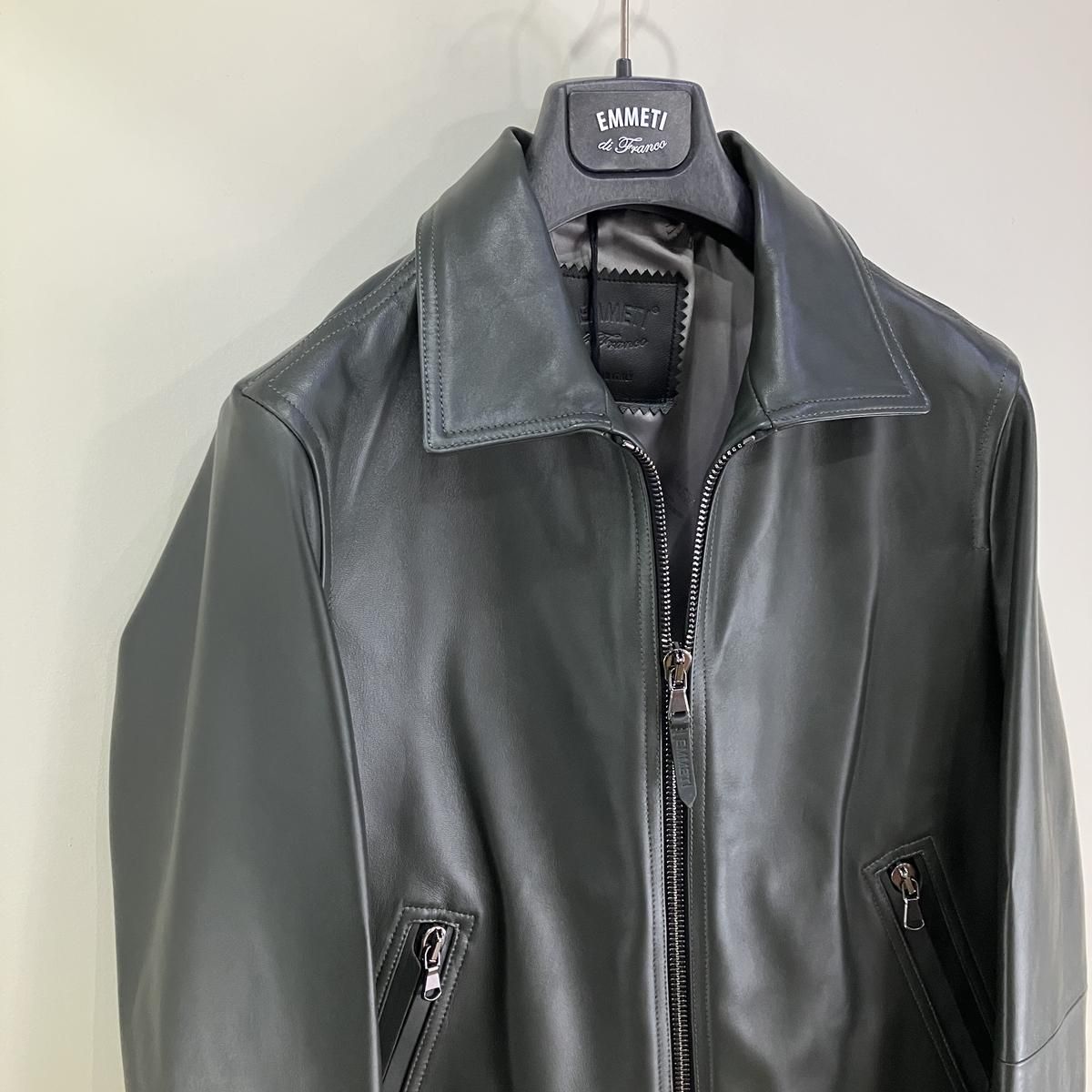 シングルライダースにシャツ襟のデザインを加えたモデルがこちらの"GIACOMO(ジャコモ)"です。袖付けのスプリットラグランは、前身はセットインでスマートに見え、後身はラグランで運動量を確保、という見映えと機能性が両立した仕様です。素材はビッグメゾンも採用するタナリーのロウ引き加工を施したラムスキンナッパレザー"NAPPA CERATA(0.7ミリ)"を使用。ナッパらしくきめ細やかなレザーの質感は高級感があり、柔らかで重さをさほど感じさせません。ほのかな光沢感があります。さらに色にも今回こだわり、黒に非常に近いながらもかなり濃いダークグリーン。ワードローブにまだお持ちでない色目が新鮮です。黒とのコーディネイトも楽しめる逸品です。