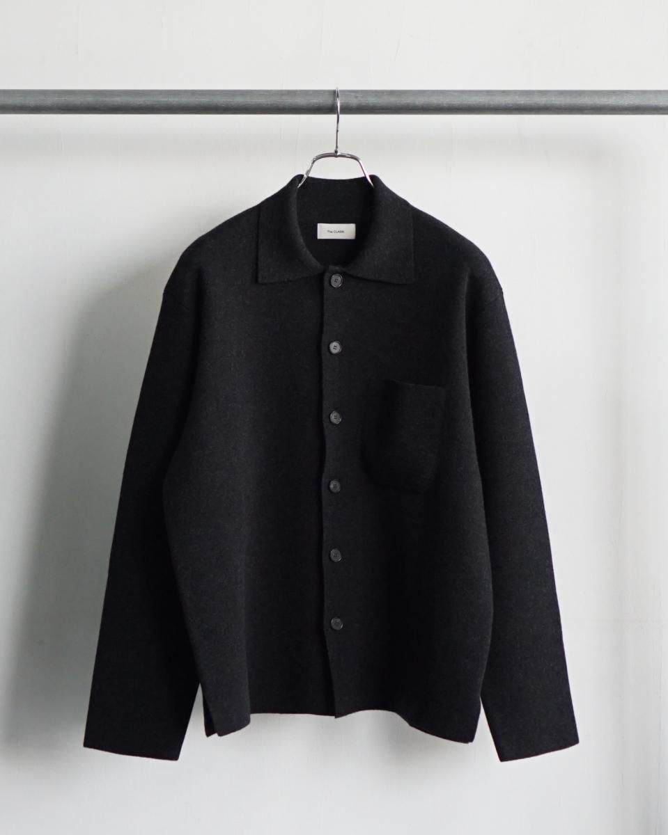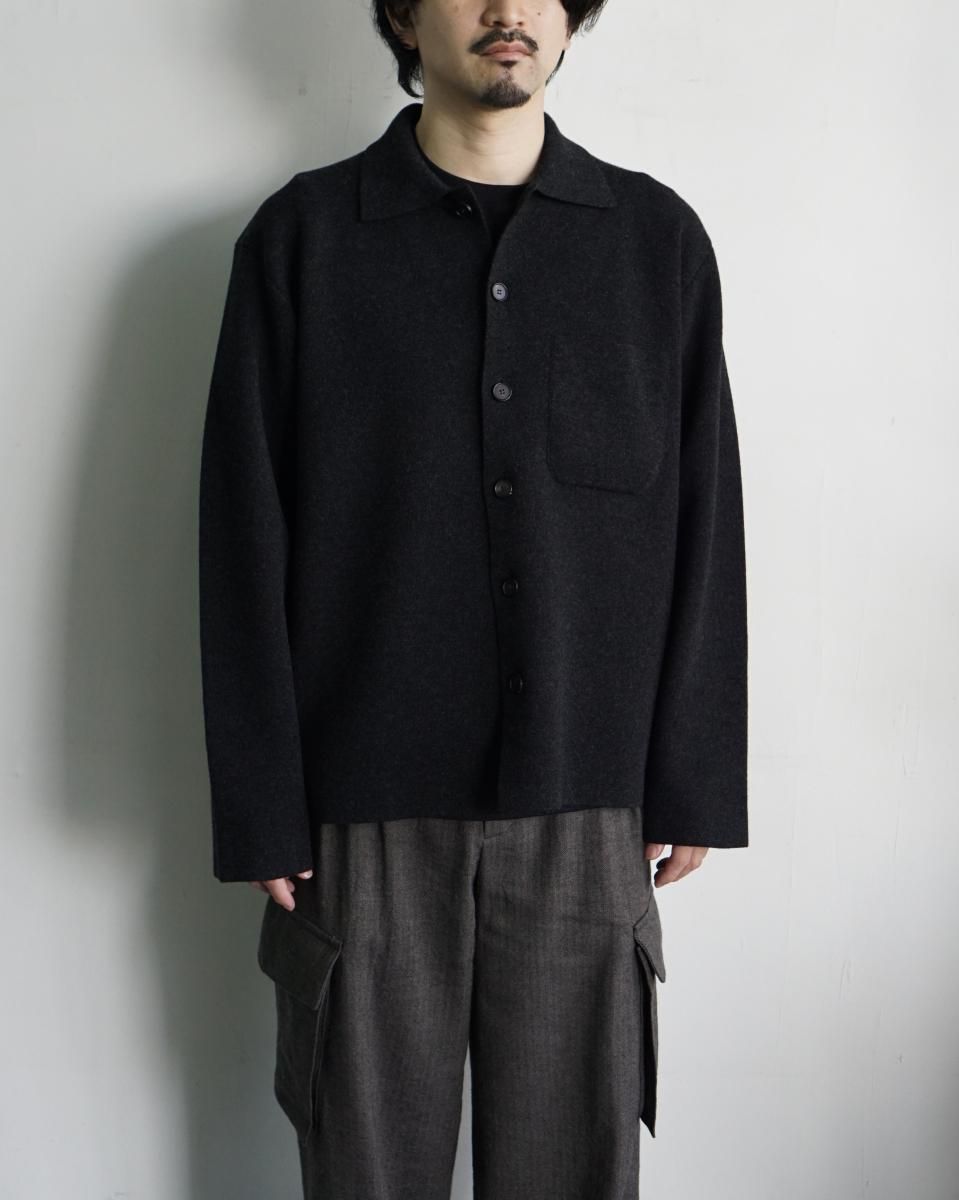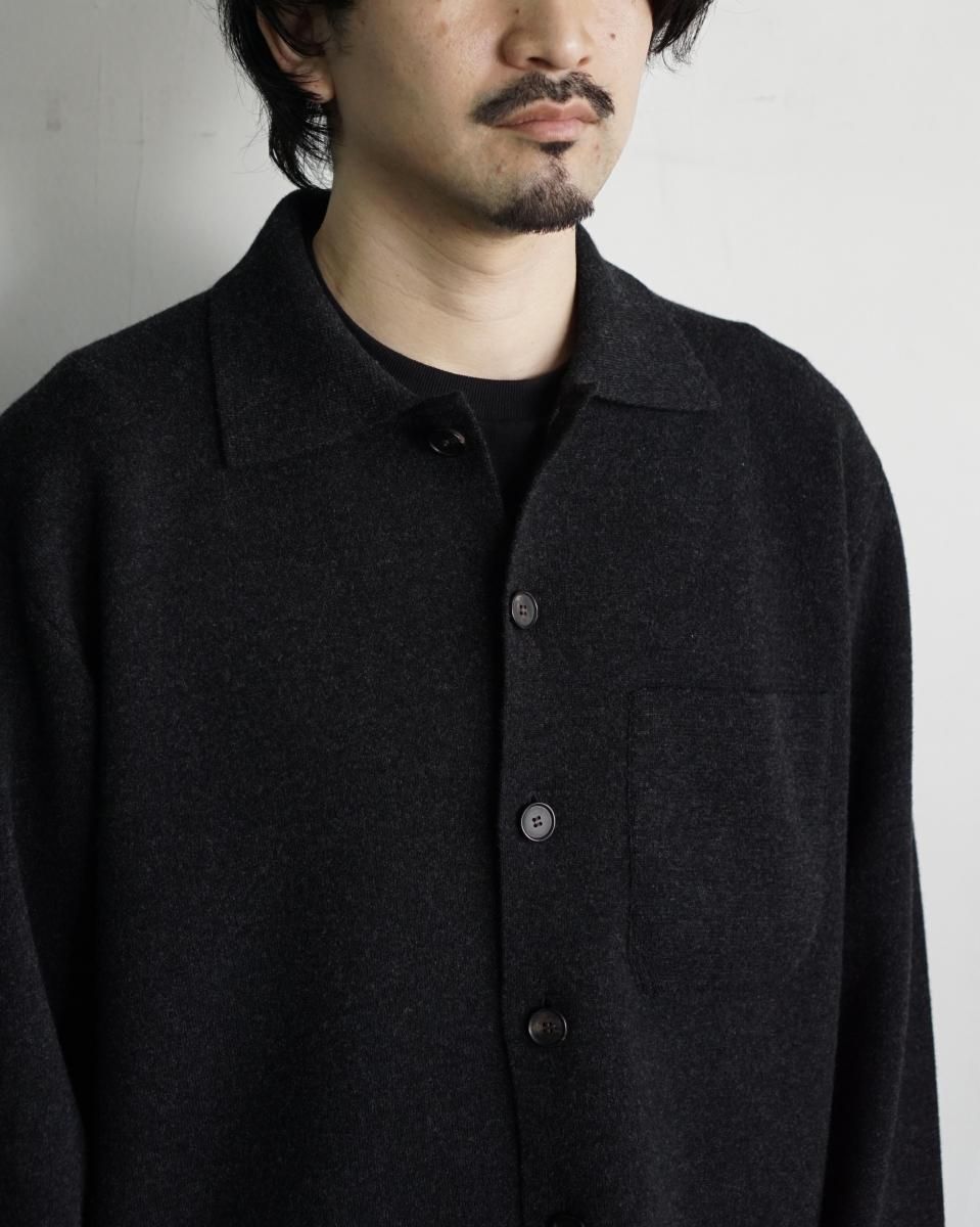 ・肌触りのよいラムウールをスムース編みで編み立てキックバックのあるしっかりとした質感で仕上げたニット素材のシャツカーディガン。
