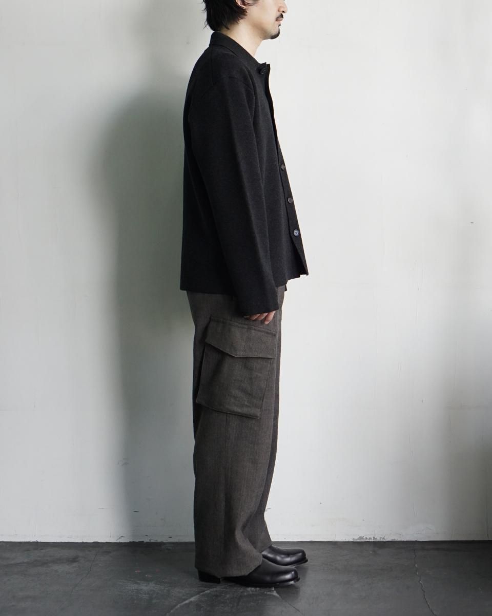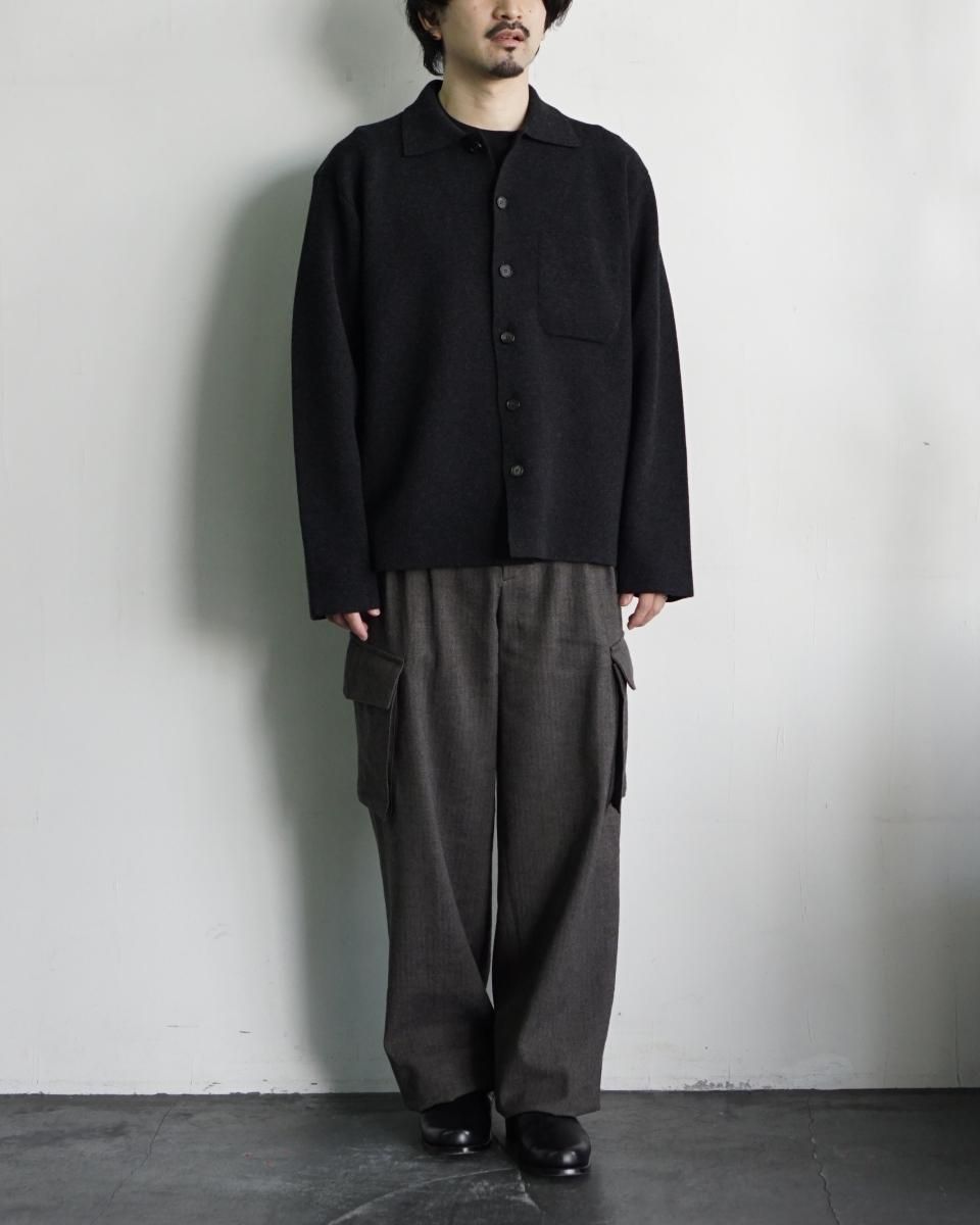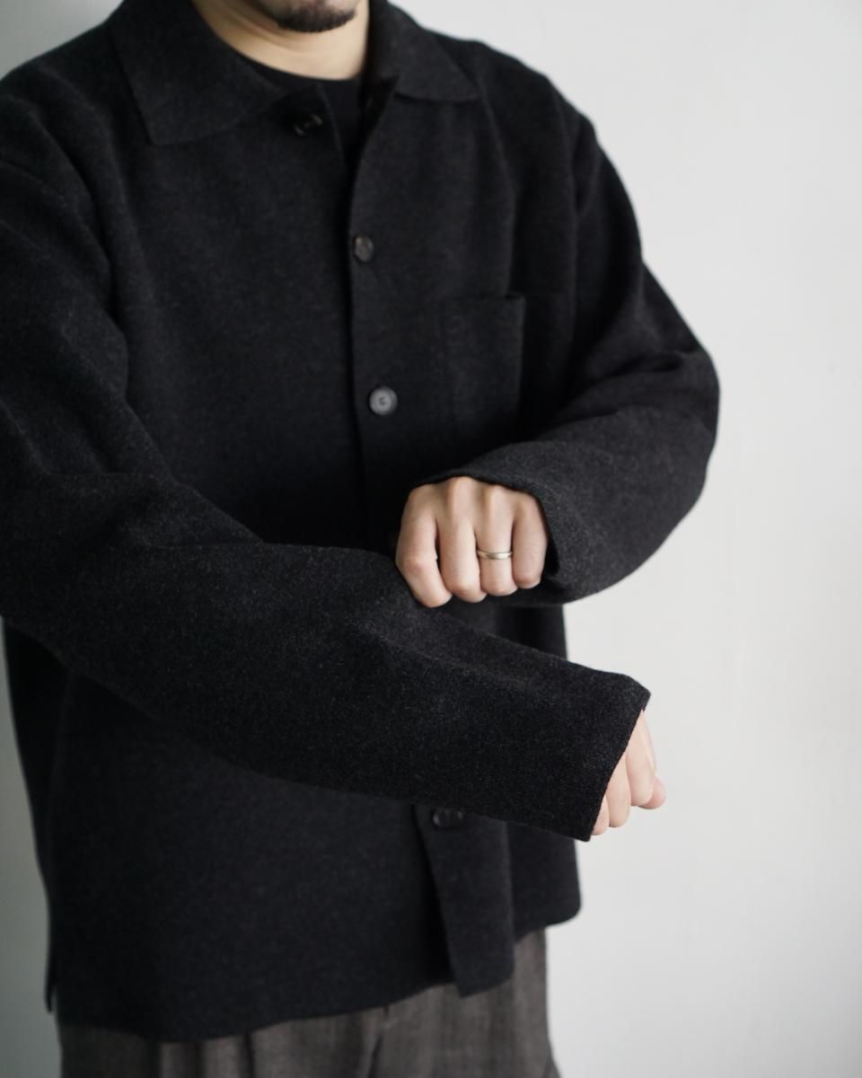 ・肌触りのよいラムウールをスムース編みで編み立てキックバックのあるしっかりとした質感で仕上げたニット素材のシャツカーディガン。