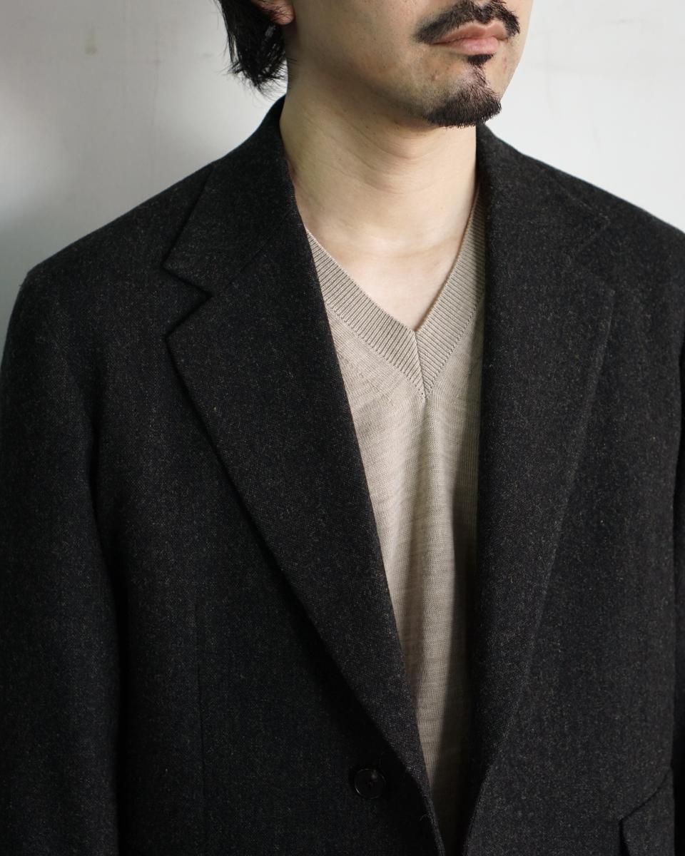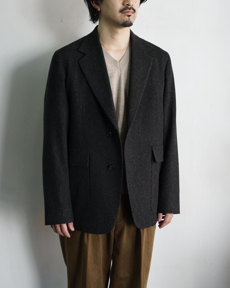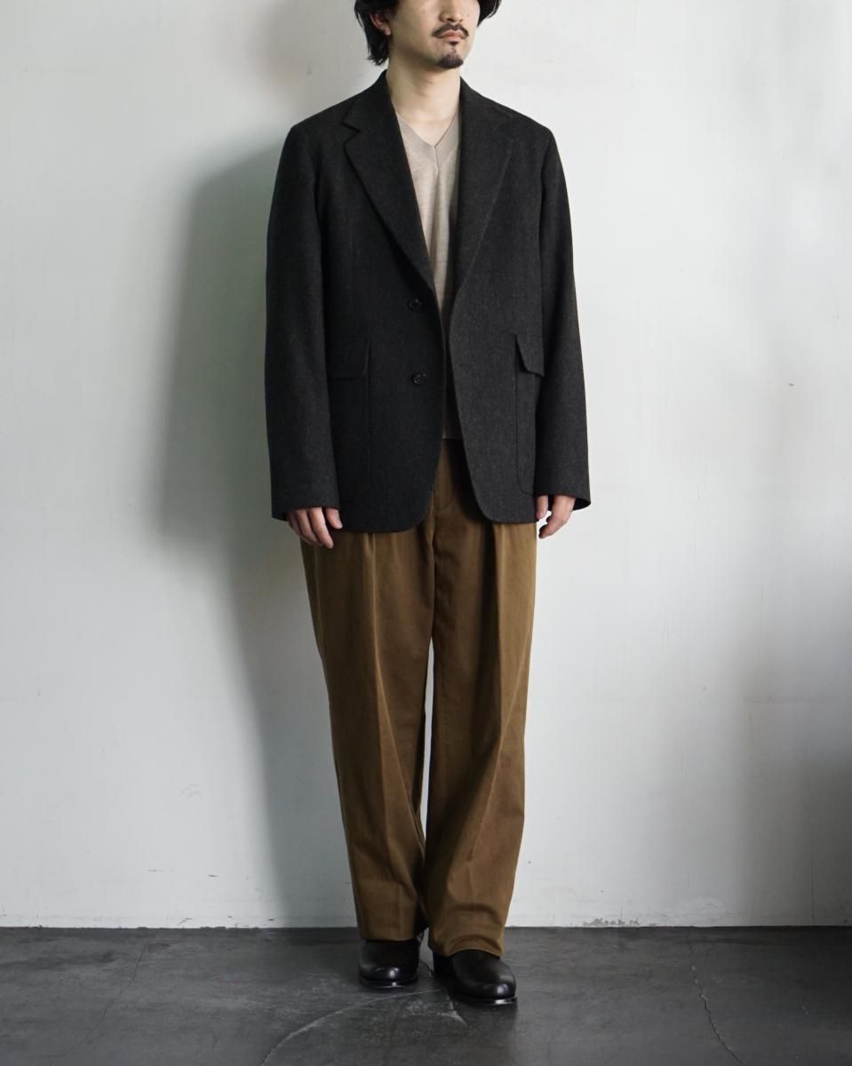 ・ツイードというよりもサキソニーとフラノの中間のような生地感になっており、見た目のウォーム感はありながら軽い着心地に仕上がっています。