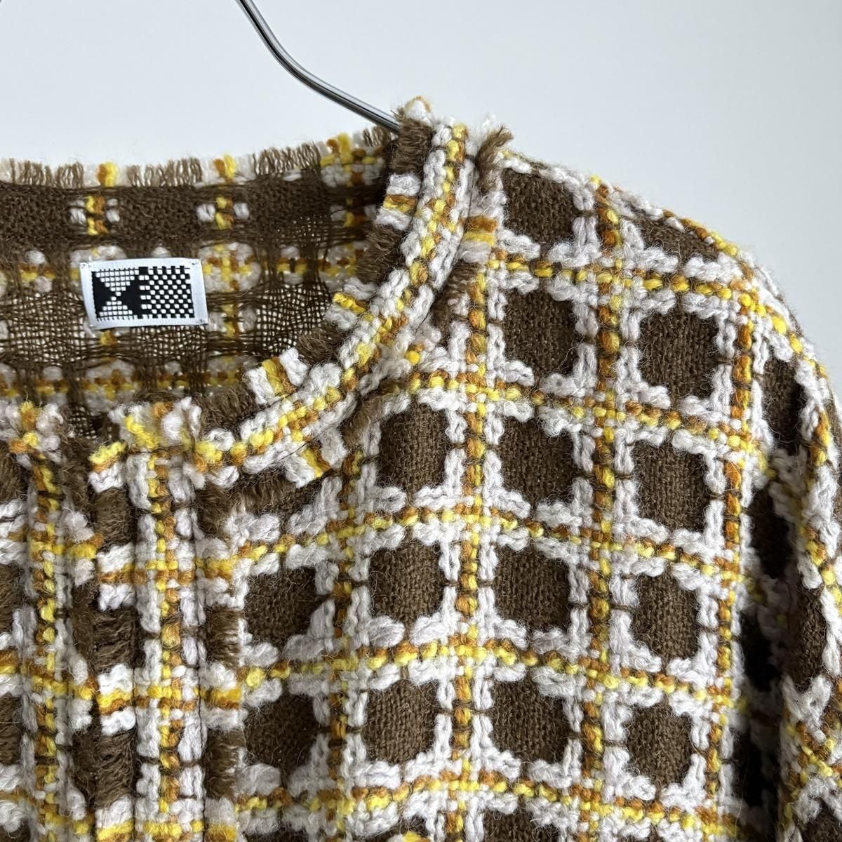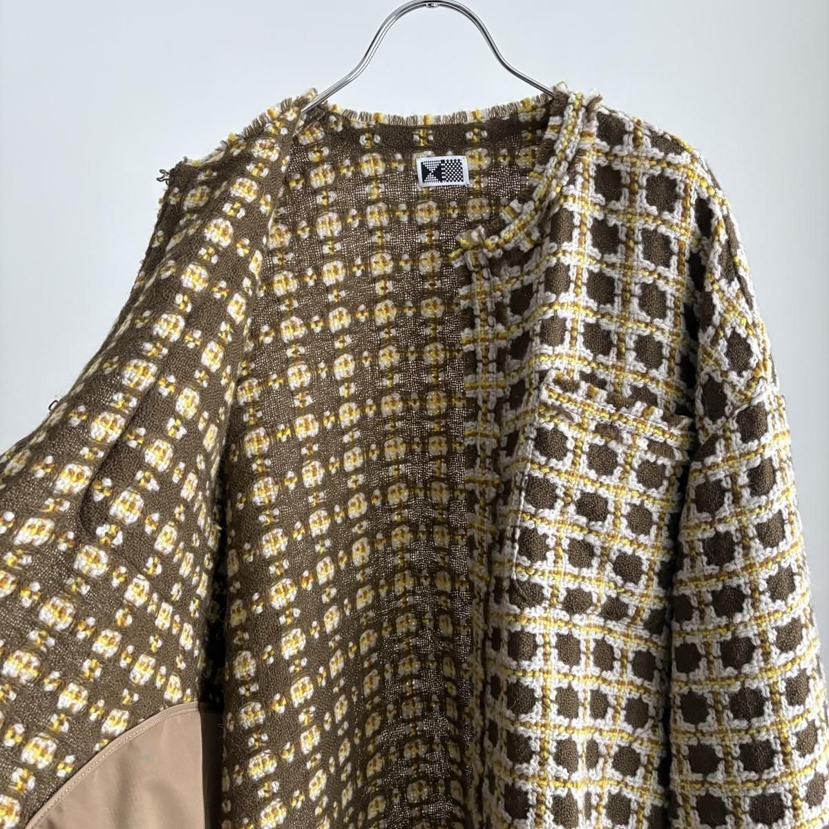 上品な丸首のノーカラーのジャケットです。とにかくこのシリーズは個性豊かな生地がまず一番の魅力です。ジャケットのかたちは気負い感のない、ラフなシルエット。カーディガン感覚的にバサッと羽織っても成立します。フロントは3個のカギホックで留めるデザインです。左右の胸ポケットのデザインもさり気なくもアクセントに!生地端をフリンジカット始末にすることで、ニュアンスのある表情がプラスされています。