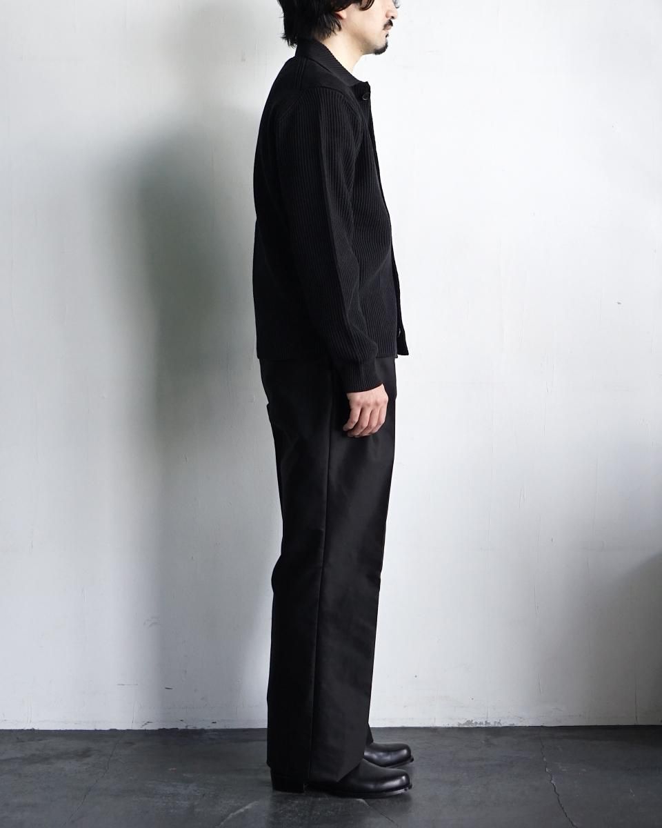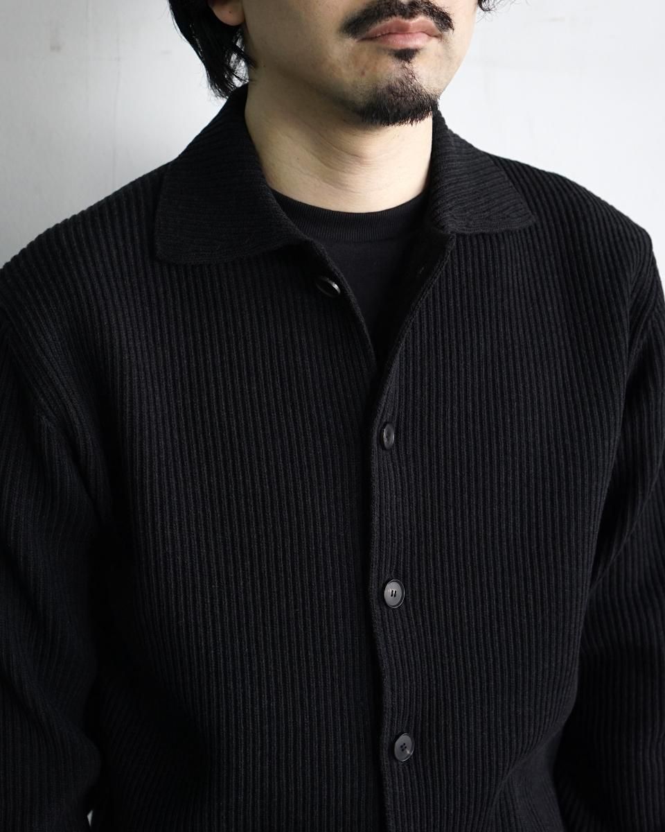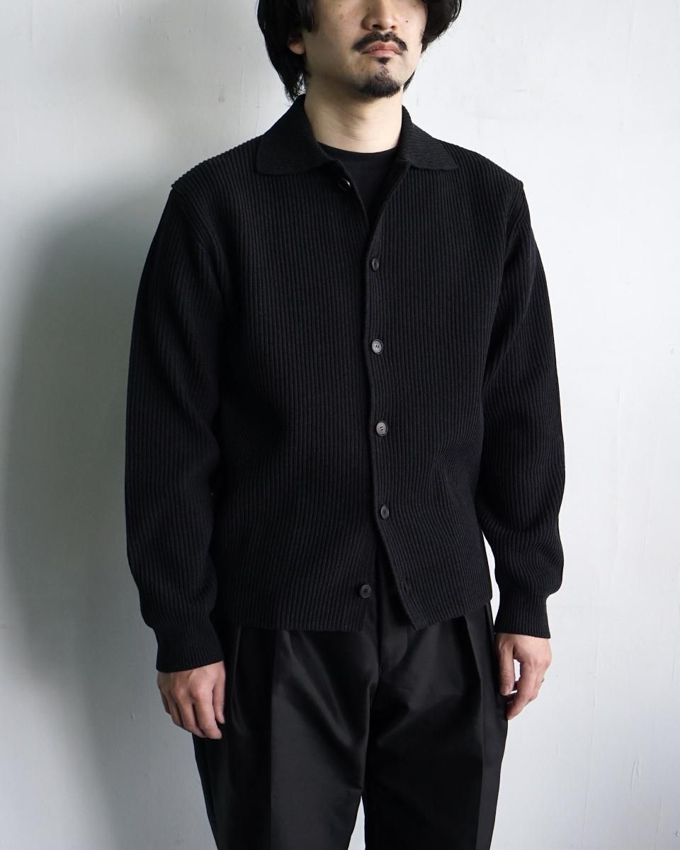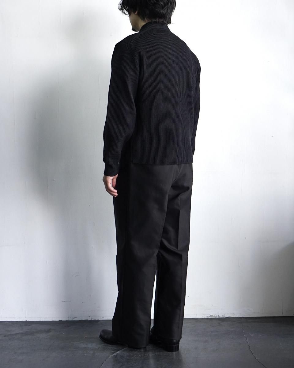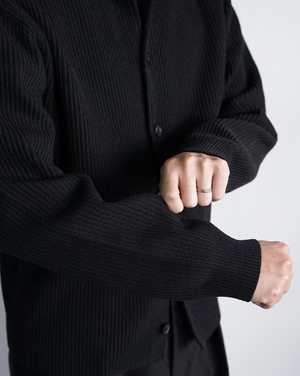 ・Super160'sの超極細番手ウールを紡毛に紡績し、限界まで度目を詰めて編み立てた両畦編みニットです。