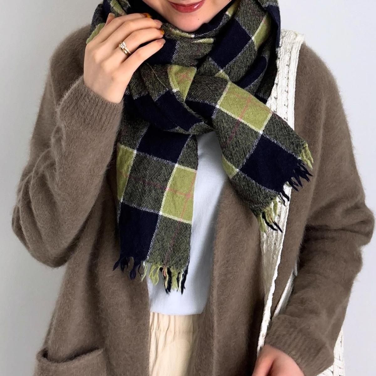 ショール風な巻き方から首にぐるっとまくにしても、おさまりが良く丁度良くまとまります。