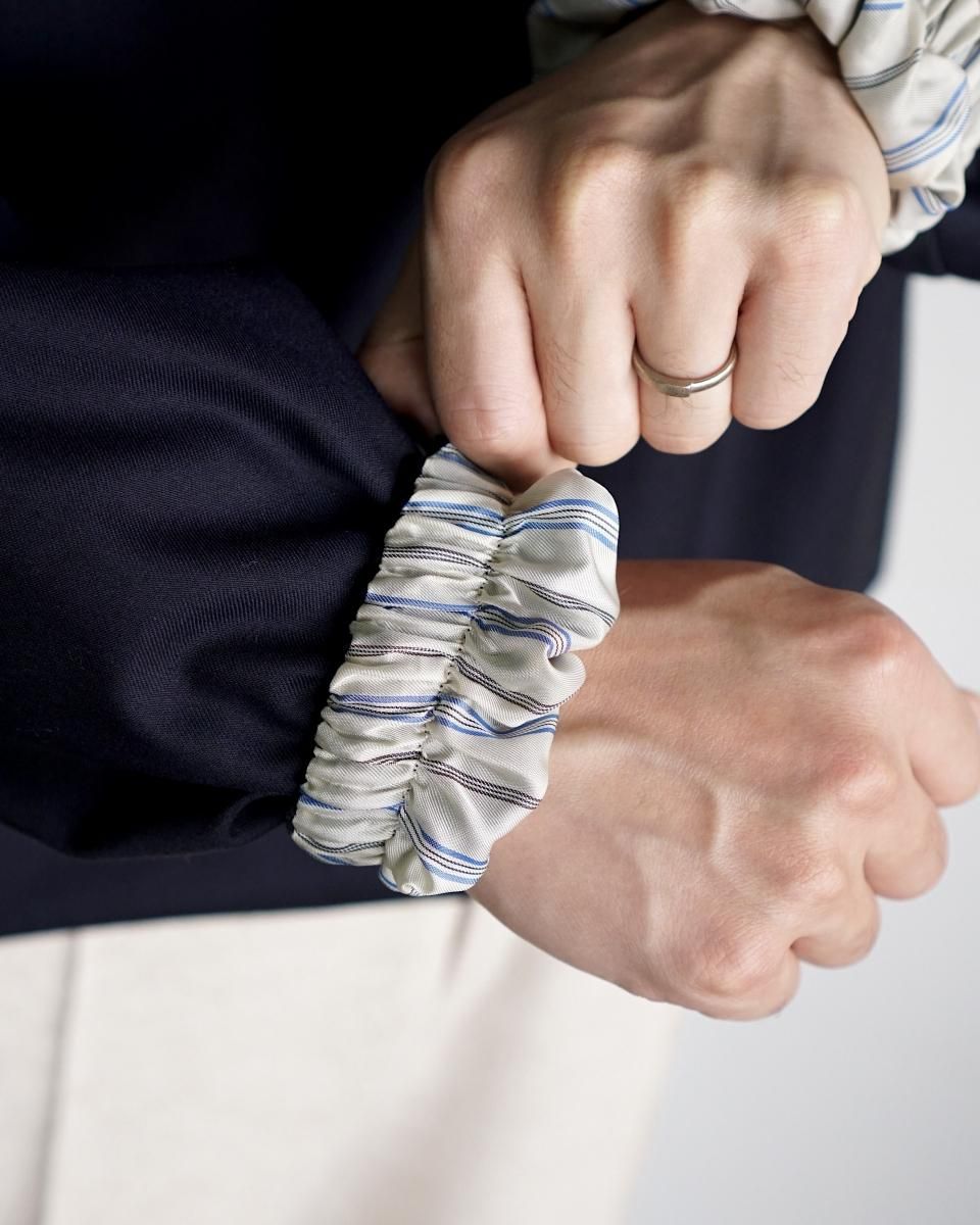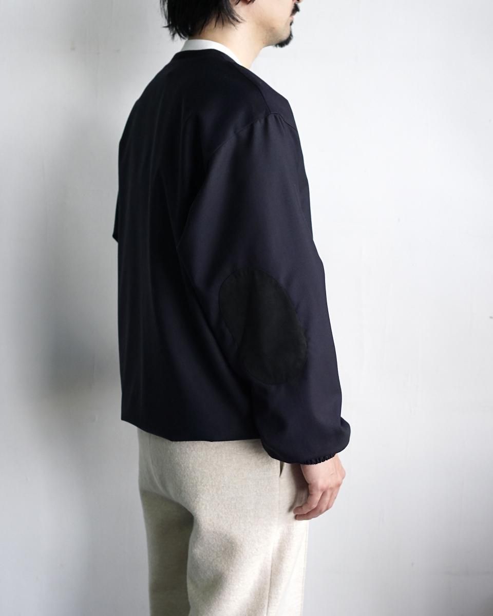・裏地にはキュプラのストライプ生地を組み合わせており、折り返した袖口からのぞく裏地や、エクセラジップ、ファイクレザーのエルボーパッチなどさりげないディテールも魅力です。