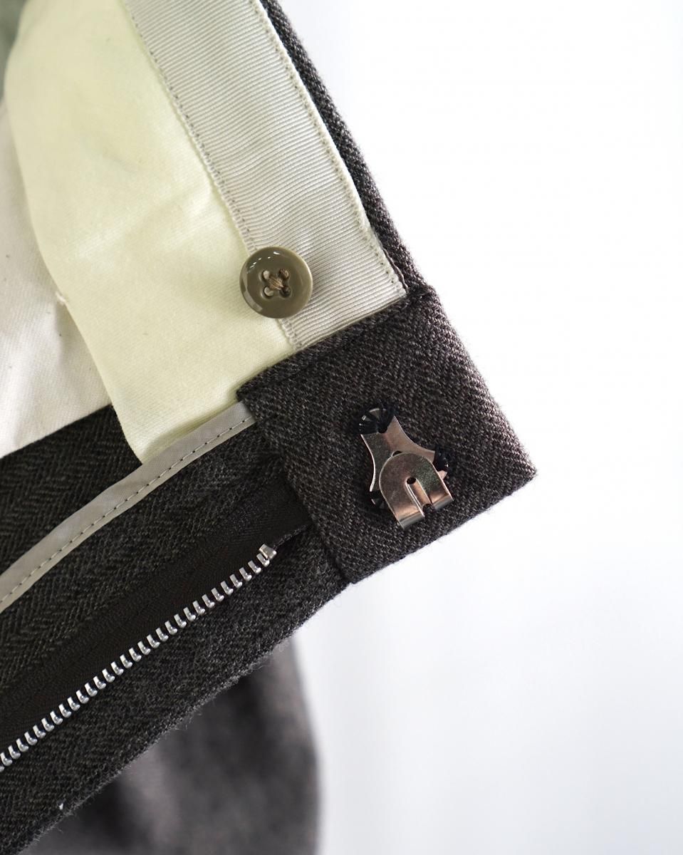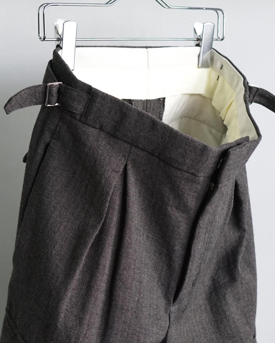 ・インラインでは展開していない生地をセレクトしており、グレイッシュなブラウンの色も最高なウール・リネン・カシミヤ素材のアルチザンな雰囲気漂うヘリンボーン生地。