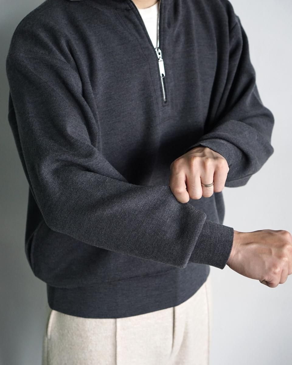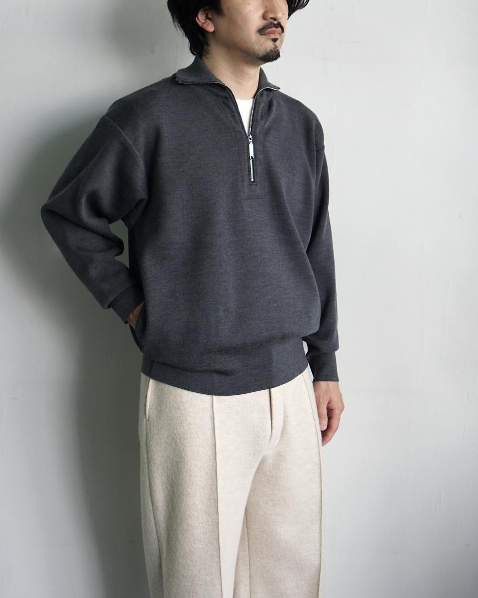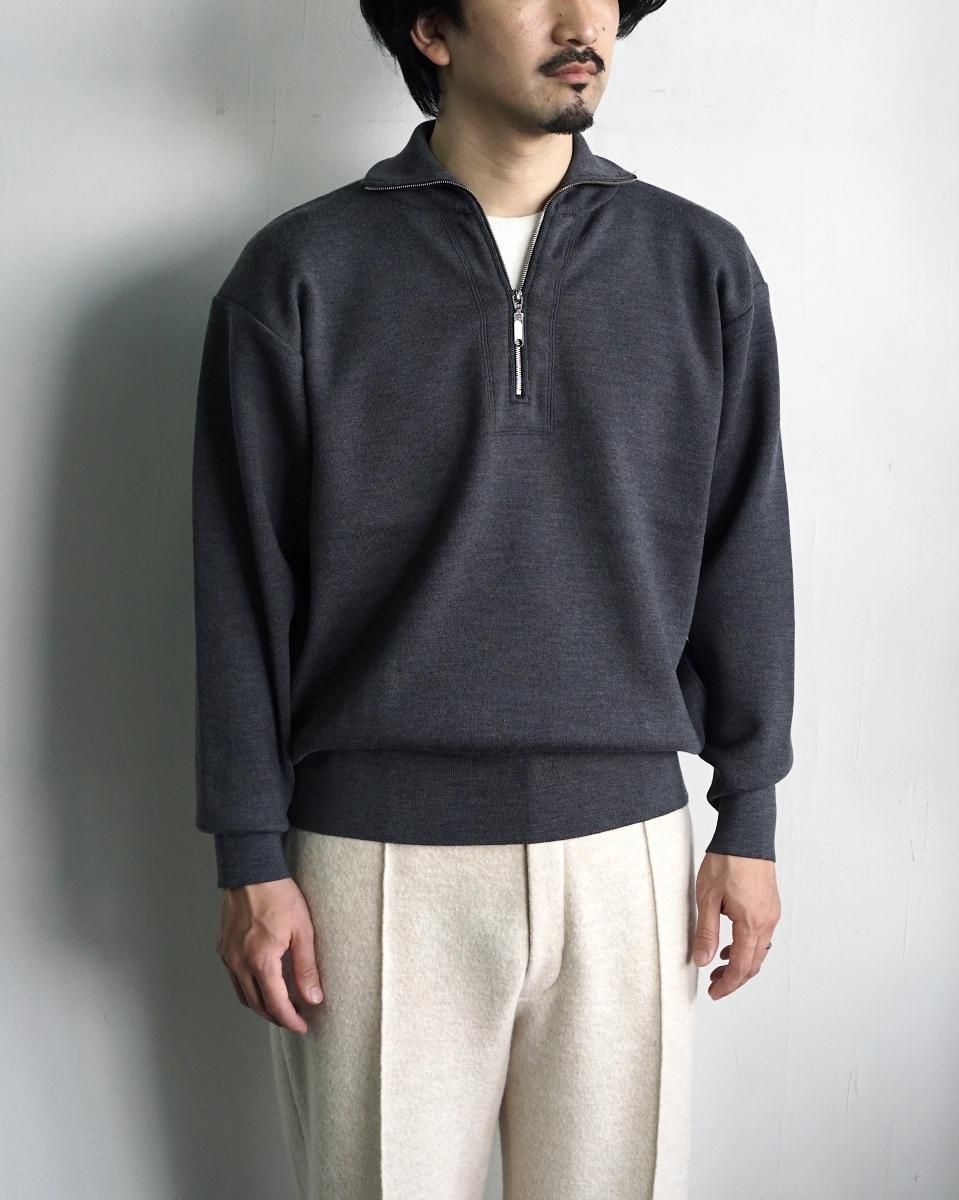 ・本来ハイゲージのニットで使用される極細梳毛ウールをジャージ素材のように編み立てたハーフジップニット。