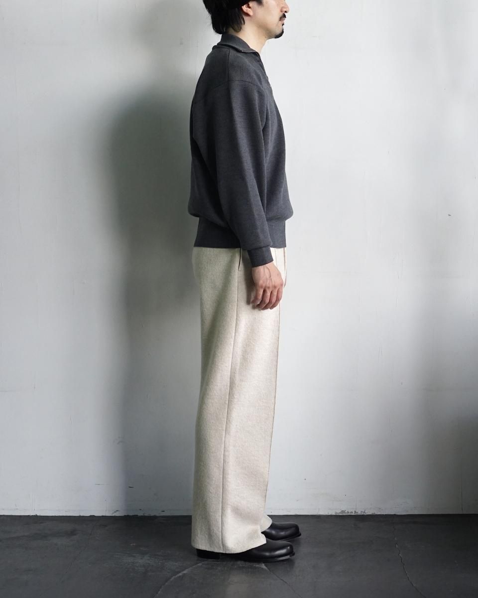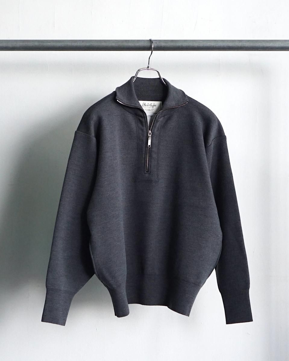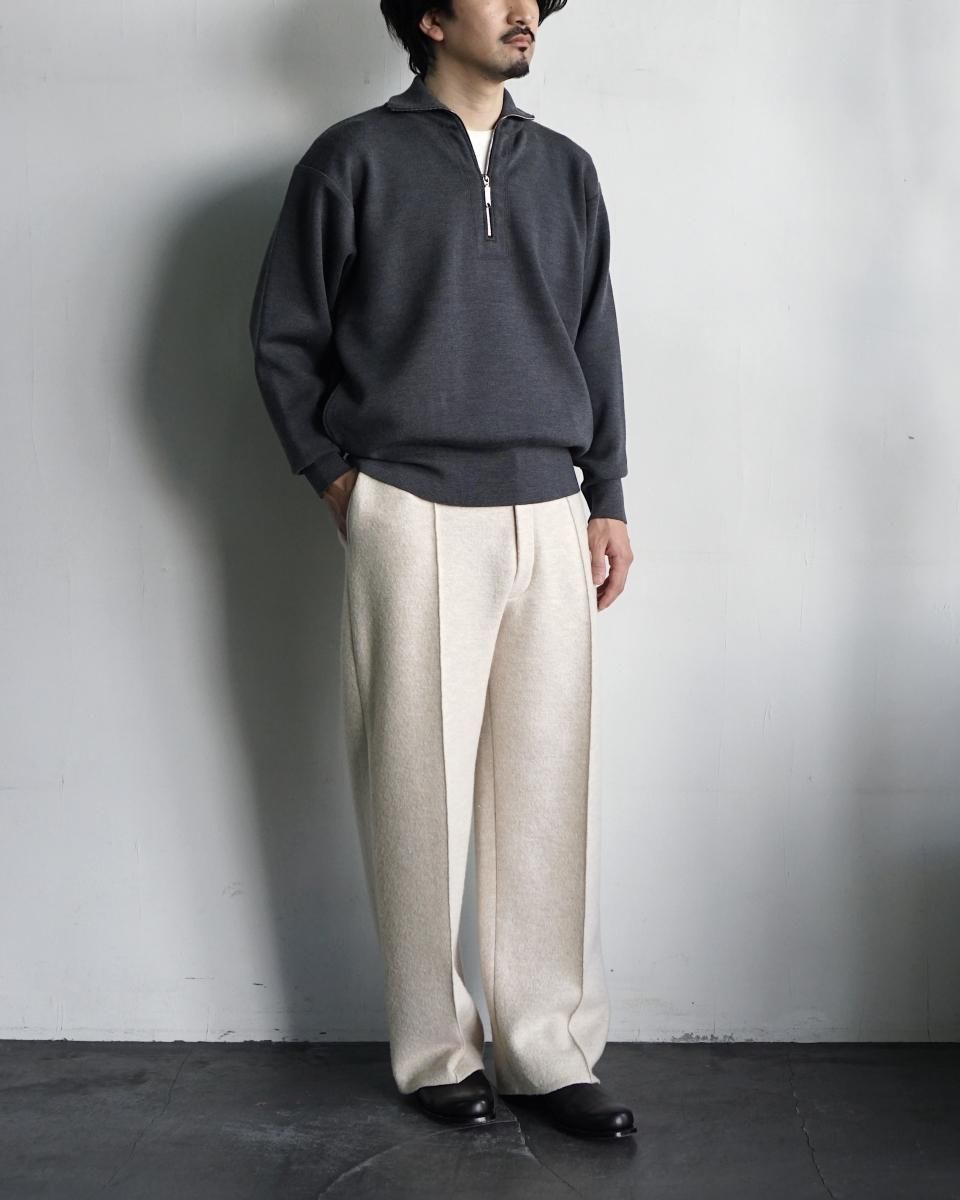 ・本来ハイゲージのニットで使用される極細梳毛ウールをジャージ素材のように編み立てたハーフジップニット。