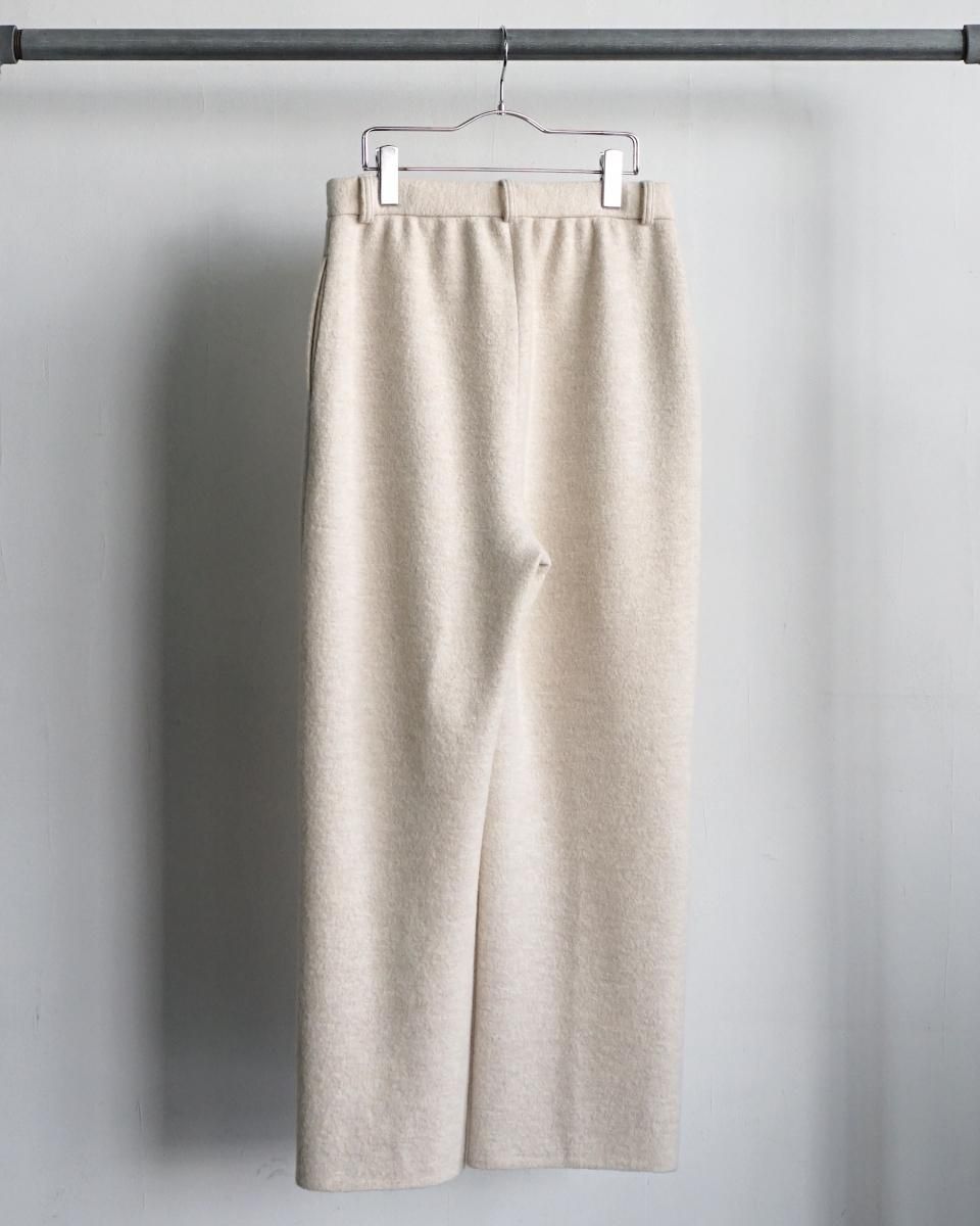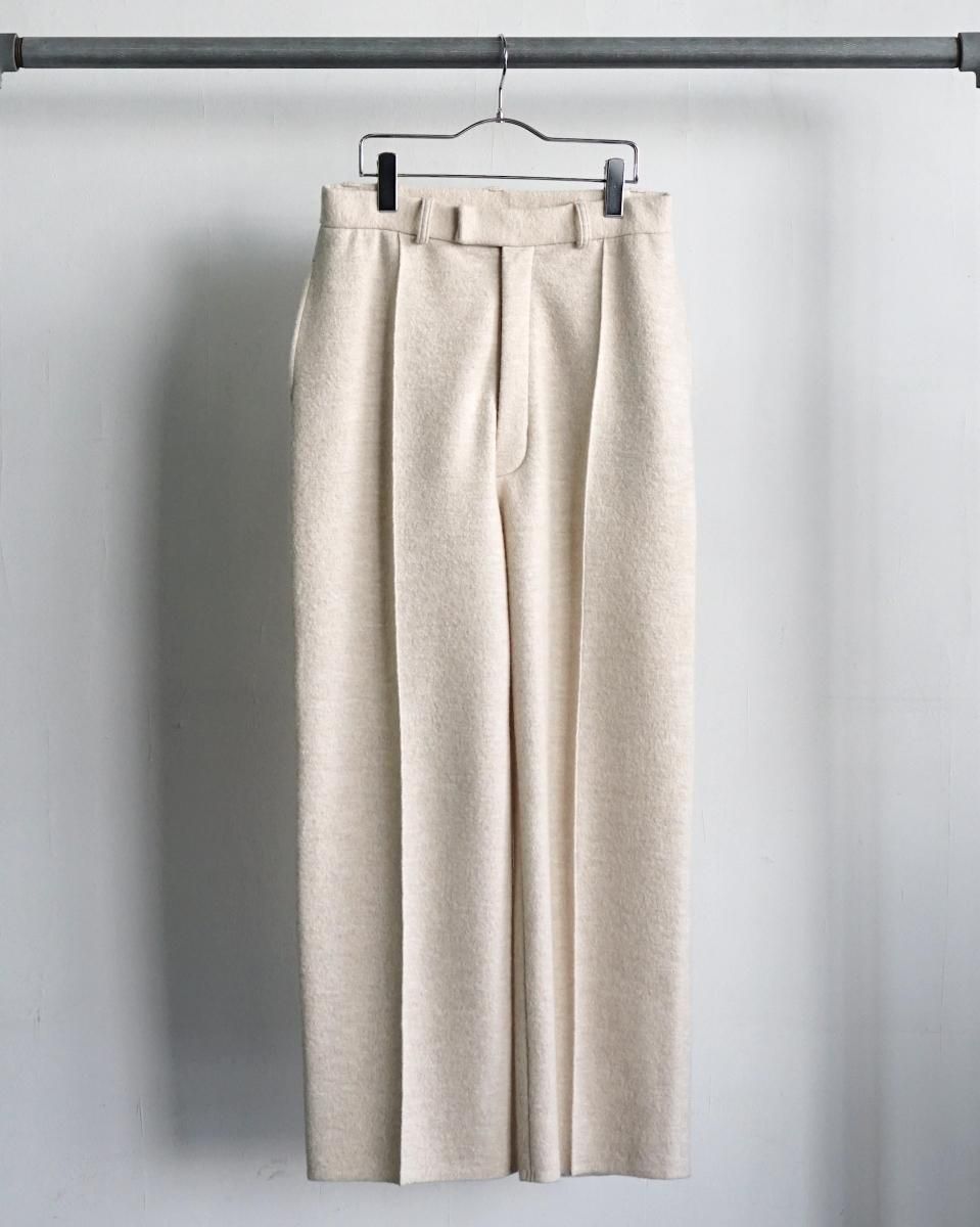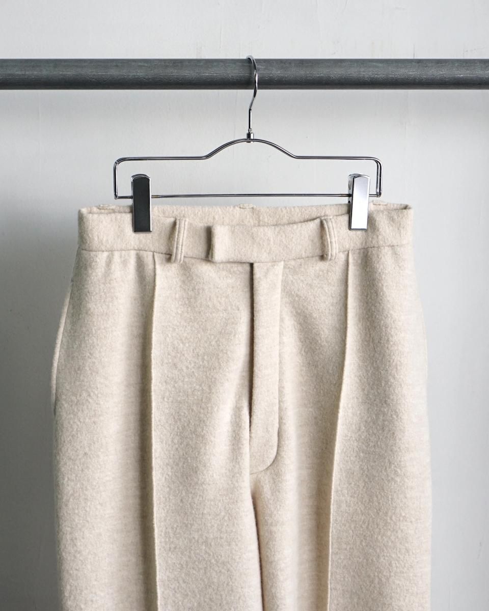 ・ウールを縮絨させて目が詰まりつつふっくらとした独特な素材感が特徴のブランド初となるニットスラックス。